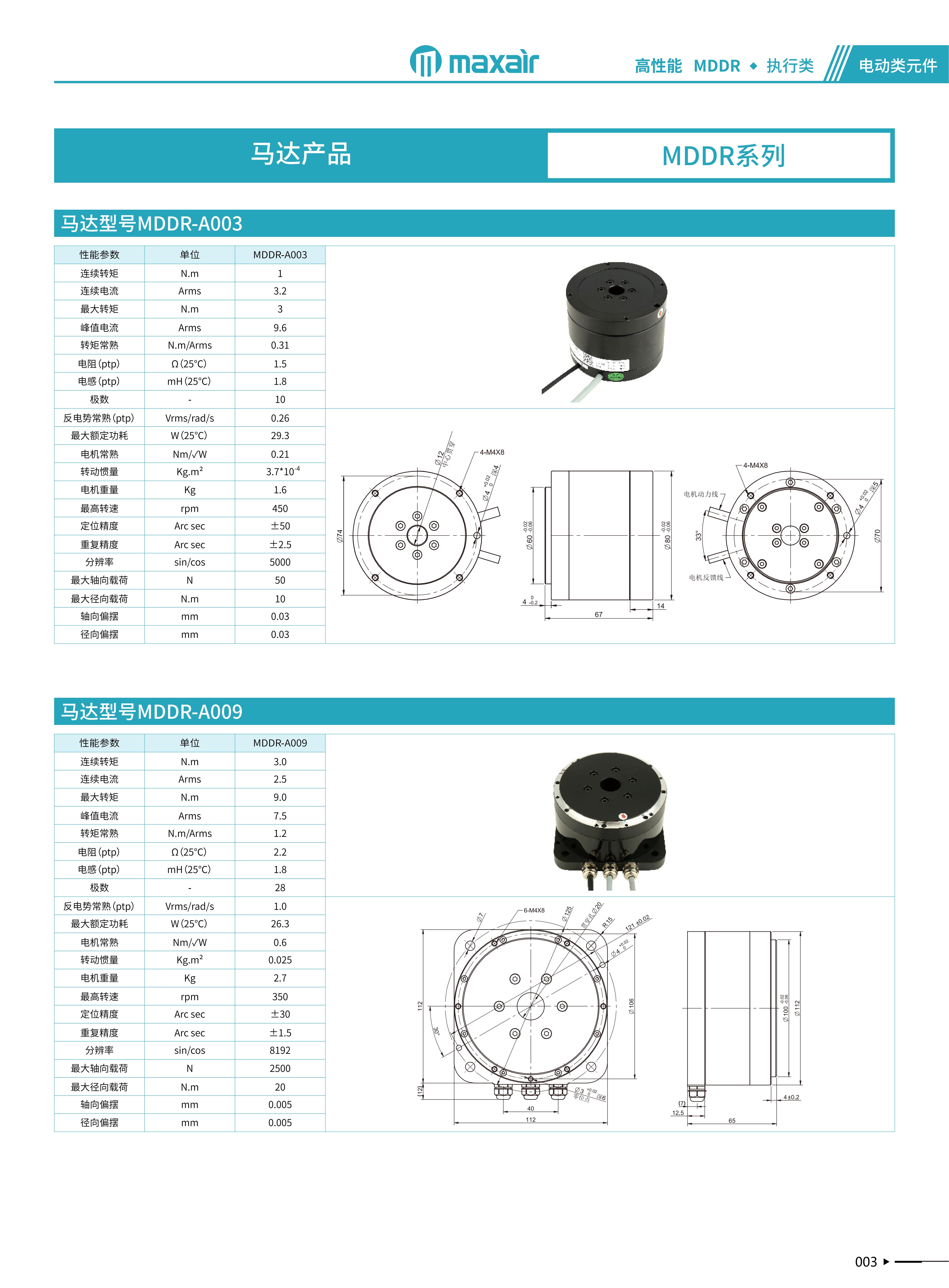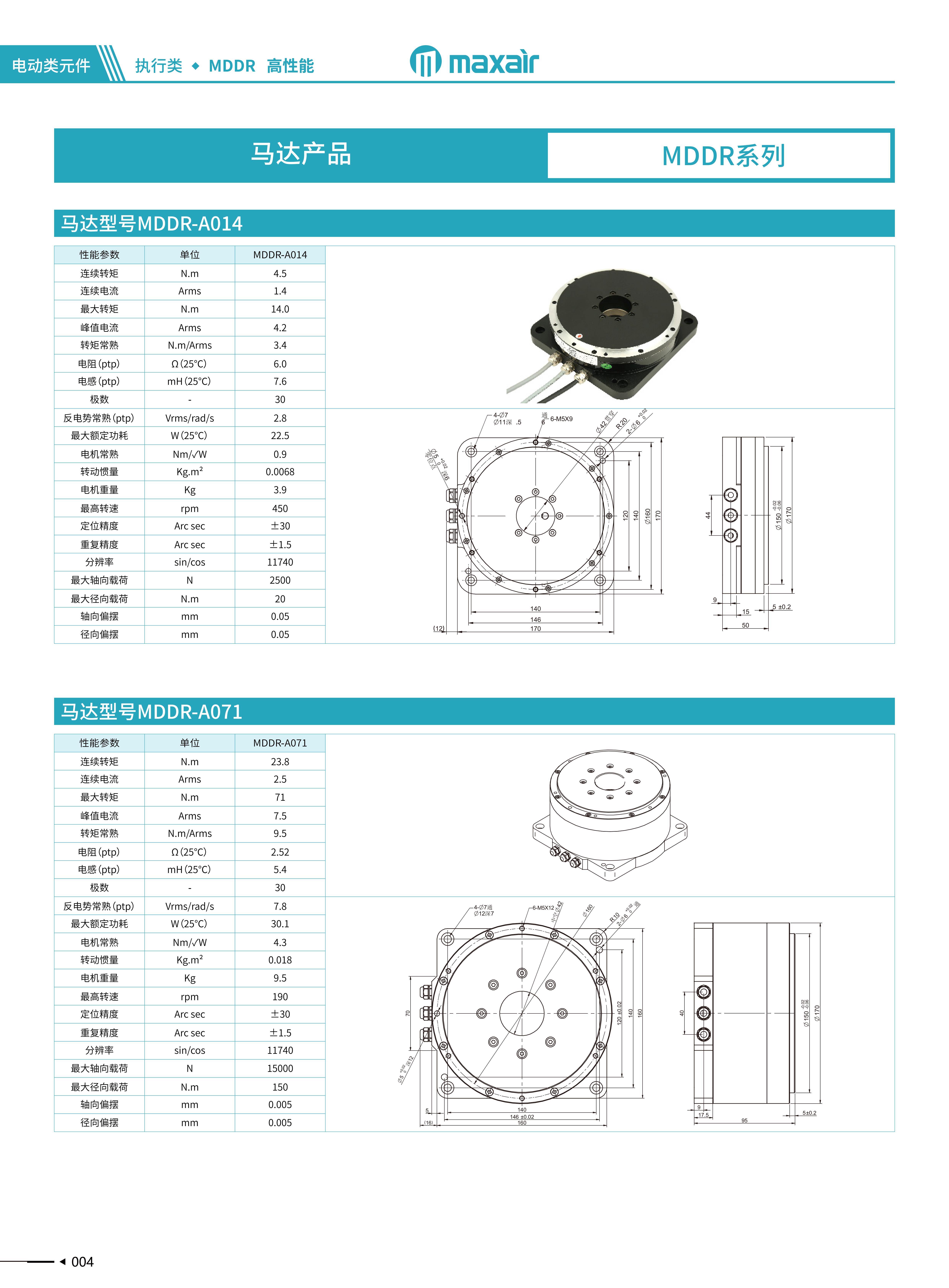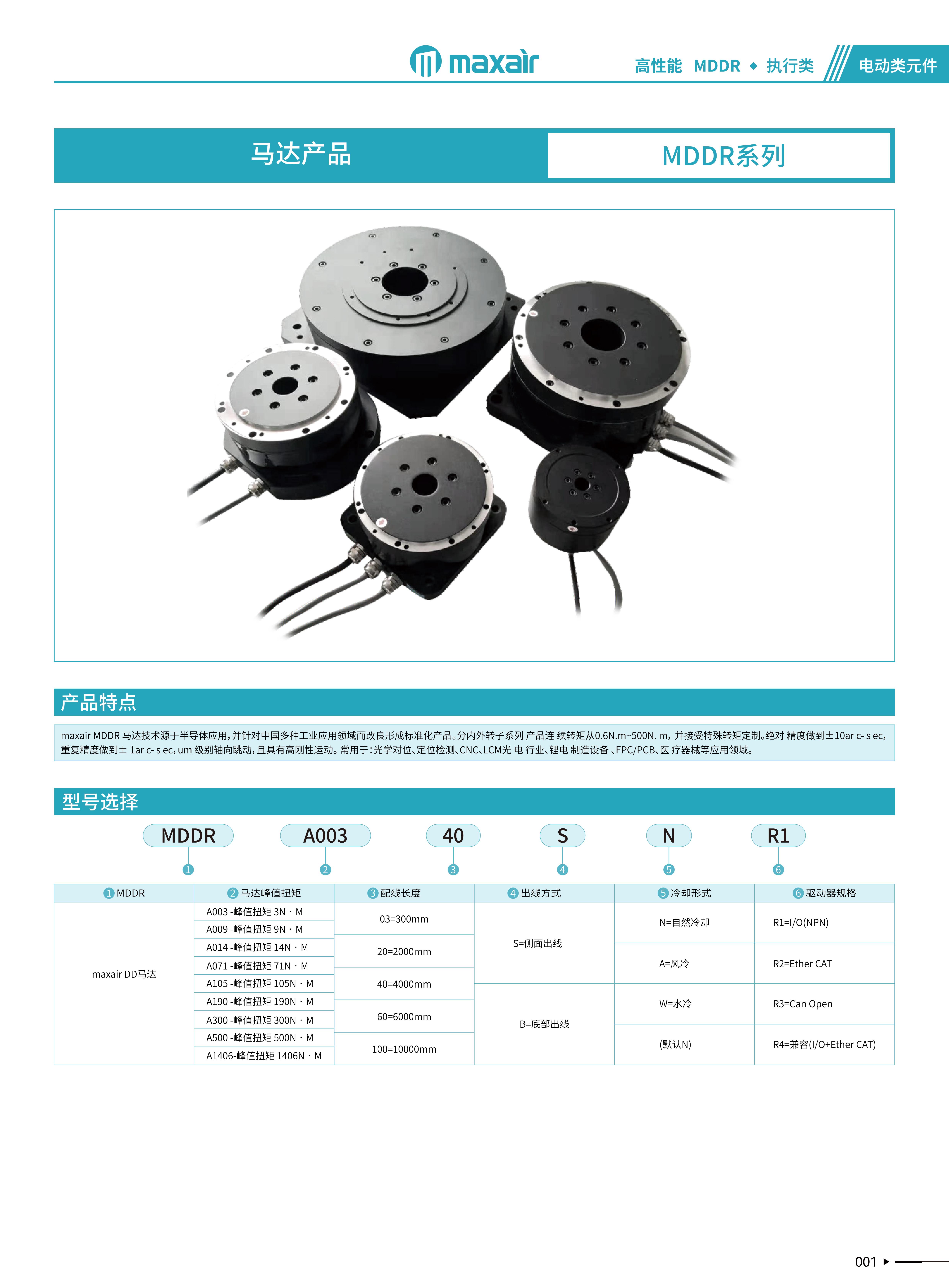 MAXAIR MDDR马达技术源于半导体应用,并针对中国多种工业应用领域而改良形成标准化产品。分内外转子系列产品连续转矩从0.6N.m~50N.m,并接受特殊转矩定制,绝对精度做到±10arc-sec,重复精度做到±larc-sec,um级别轴向跳动,且具有高刚性运动。 常用于:光学对位、定位检测、CNC、LCM光 电行业、锂电 制造设备、FPC/PCB、医疗器械等应用领域。
